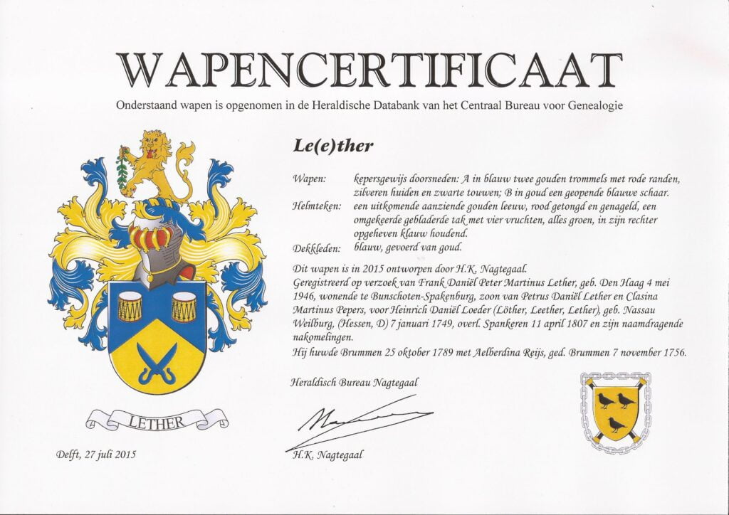 Tenslotte vond er enige discussie plaats over de schrijfwijze van onze familienaam, met één ‘e’ en met twee ‘e’s’. Hijzelf vindt deze oplossing de minst mooie. Beide namen was geen optie. Hij adviseerde de naam van de aanvrager onder het wapen te zetten en in de tekst van het bijbehorende certificaat van echtheid dat ook de dragers met de naam Leether / Löther dit wapen mogen voeren. Dus officieel met een 'e' en in de beschrijving op het certificaat en op de rest van de site met één en twee 'e''s. Dat vond ik niet galant voor die familieleden, zodat ik toch voor deze oplossing heb gekozen.